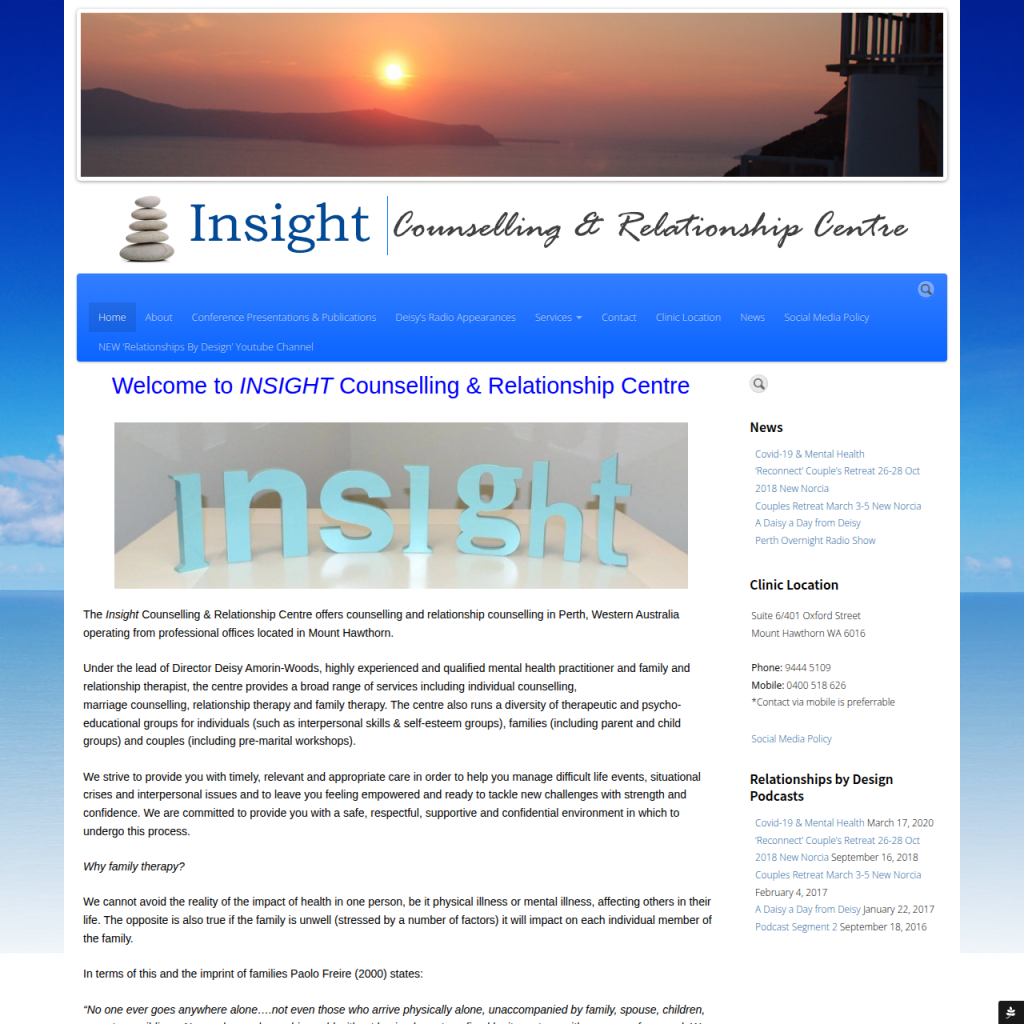 Insight Counselling & Relationship Centre is a Perth-based therapeutic practice that provides professional counselling and relationship support services for individuals, couples and families. The centre focuses on emotional wellbeing, personal development and relational health, offering a confidential and supportive environment for clients experiencing a wide range of personal and interpersonal challenges.