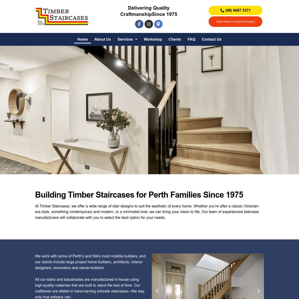 Timber Staircases’ website showcases their impressive portfolio of completed staircases and balustrades across Perth and beyond. Visitors can explore examples of traditional and modern staircase designs, read about their comprehensive process and submit an enquiry for a free quote or consultation. The website also highlights the company’s dedication to quality Australian craftsmanship and personalised service, reinforcing why they’re the go-to specialists for timber staircases in Perth and WA.