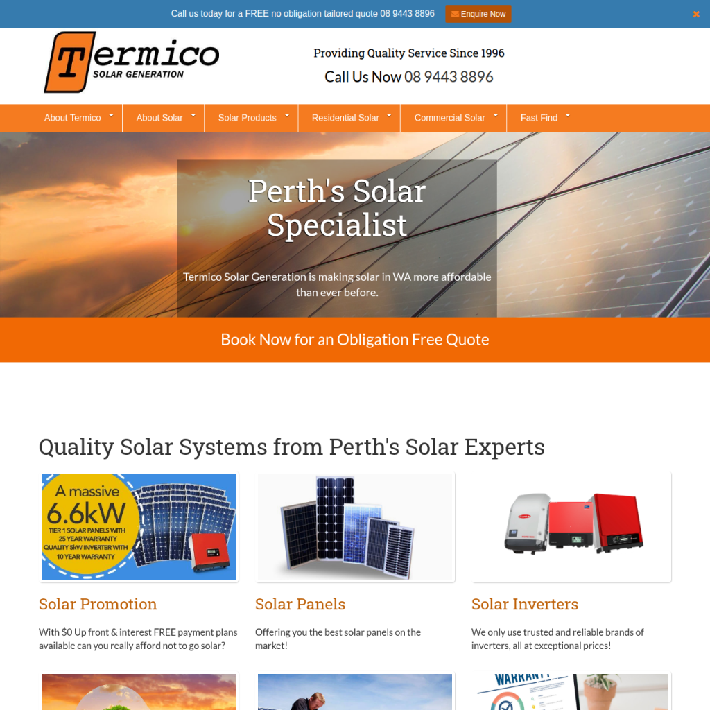 Termico Solar Generation is a Western Australian–owned solar energy company specialising in the supply, installation, and support of residential and commercial solar systems. Established in 1996, the business has grown to become a respected provider of solar panels, battery storage, inverters, and system upgrades across Perth and surrounding regions. The company focuses on delivering reliable, long-term energy solutions backed by industry-recognised warranties and accredited installers.